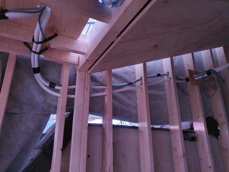 Het installeren van een Daikin 3.5kW op de slaapkamer 2e verdieping. Opbouwen van een steiger om de leidinggoot netjes langs de boeidelen te kunnen monteren.